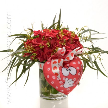 Jarrón de cristal con bouquet de rosas naturales de tallo corto, decorado con un peluche…
